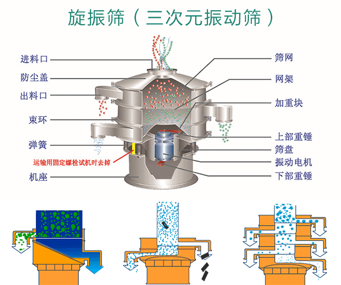 旋振篩是由電機提供振動源,從進料口投入物料,在振動狀態下穿過篩網直到出料口;防塵蓋、束環是為振動篩提供封閉狀態的。