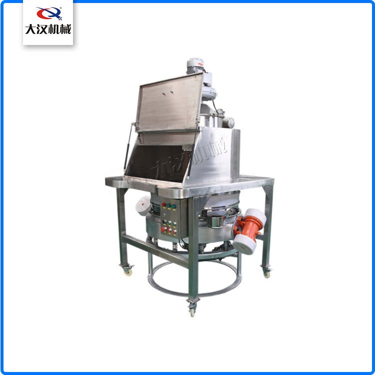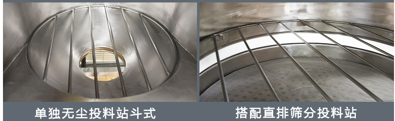 設(shè)置格柵,有效防止PE袋與粉末接觸,并配有振動(dòng)篩(一般是直排篩旋振篩),可有效攔截異物,確保出料合格。