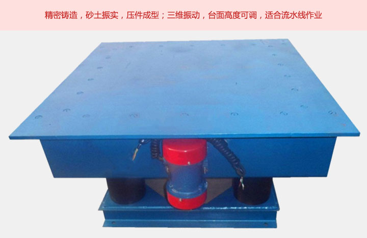 鑄造用振動平臺采用橡膠彈簧和6臺-8臺振動電機組合,具有上下,左右前后的三維振實效果,它具有多結(jié)構(gòu)支撐,結(jié)構(gòu)牢固,密封性好,性能可靠,操作簡單,振動頻率可調(diào)等特點。