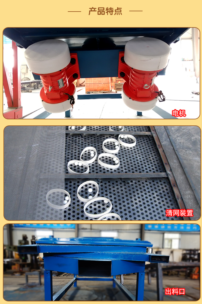 5、電機(jī)臺座:安裝振動電機(jī),使用前連接螺釘必須擰緊,特別是新篩機(jī)試用前三天、必須反復(fù)緊固,以免松動造成事故。